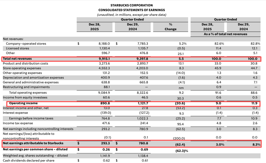 财报指出,按非GAAP准则计算,营业利润率同比下降1.8个百分点至10.1%。主要原因是为支持“重返星巴克”战略而进行的劳动力投资以及由咖啡(豆)价格上涨和关税上涨引起的通胀压力。