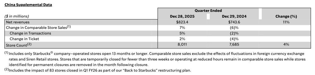 中国市场补充数据,来源于星巴克第一财季财报